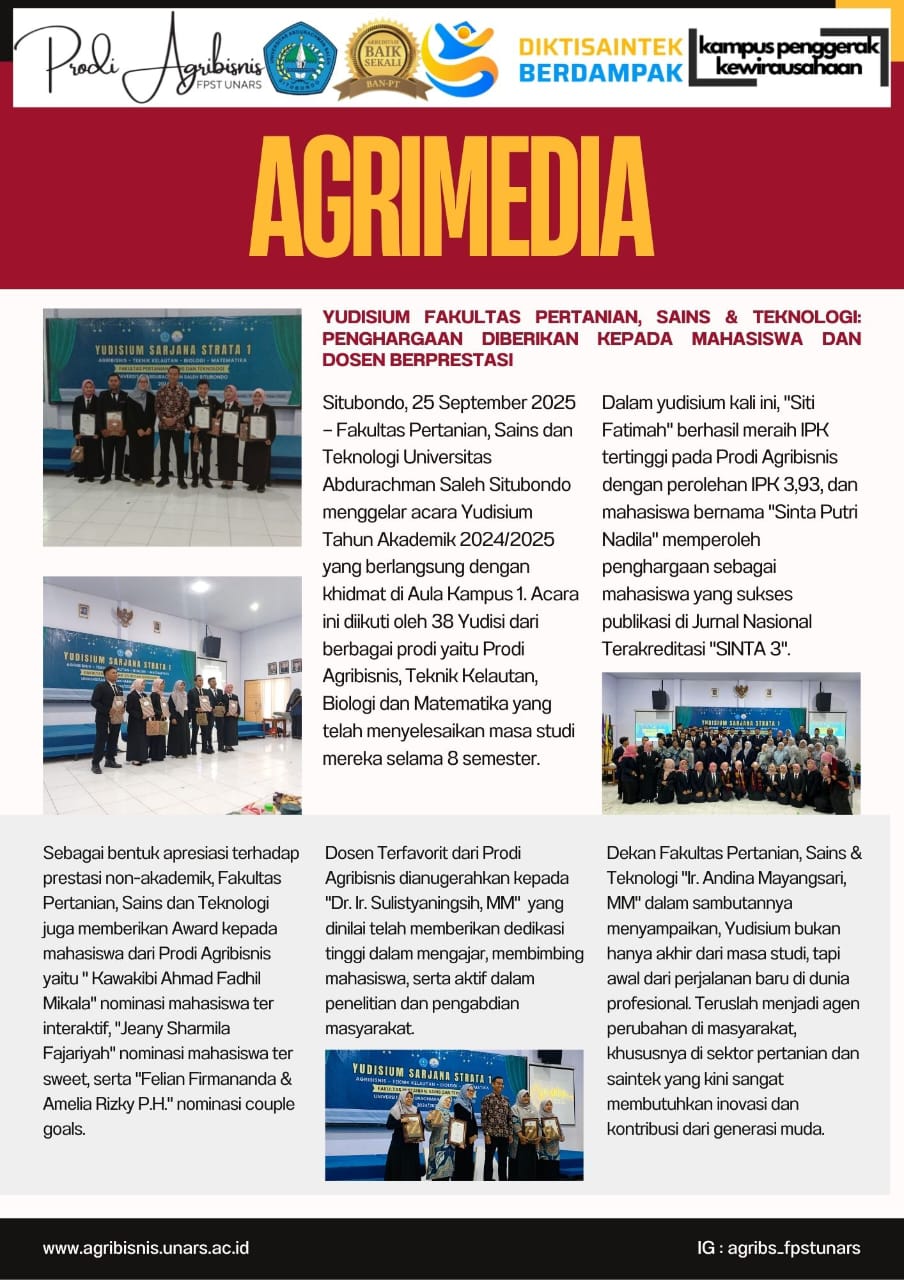 Dosen Fakultas Pertanian, Sains, dan Teknologi (FPST) Universitas Abdurachman Saleh Situbondo yang terdiri dari Program Studi Agribisnis, Matematika, Teknik Kelautan, dan Biologi mengikuti kegiatan Workshop Peningkatan Kapasitas Dosen dalam Penulisan Karya Ilmiah Terpublikasi di Jurnal Internasional Bereputasi, Jumat (10/10/2025). Kegiatan yang berlangsung di ruang Pascasarjana Lantai 3 UNARS ini menghadirkan Prof. Luchman Hakim, S.Si., M.Agr.Sc., Ph.D., selaku Direktur DRPM Universitas Brawijaya, sebagai pemateri utama untuk kelompok eksakta.