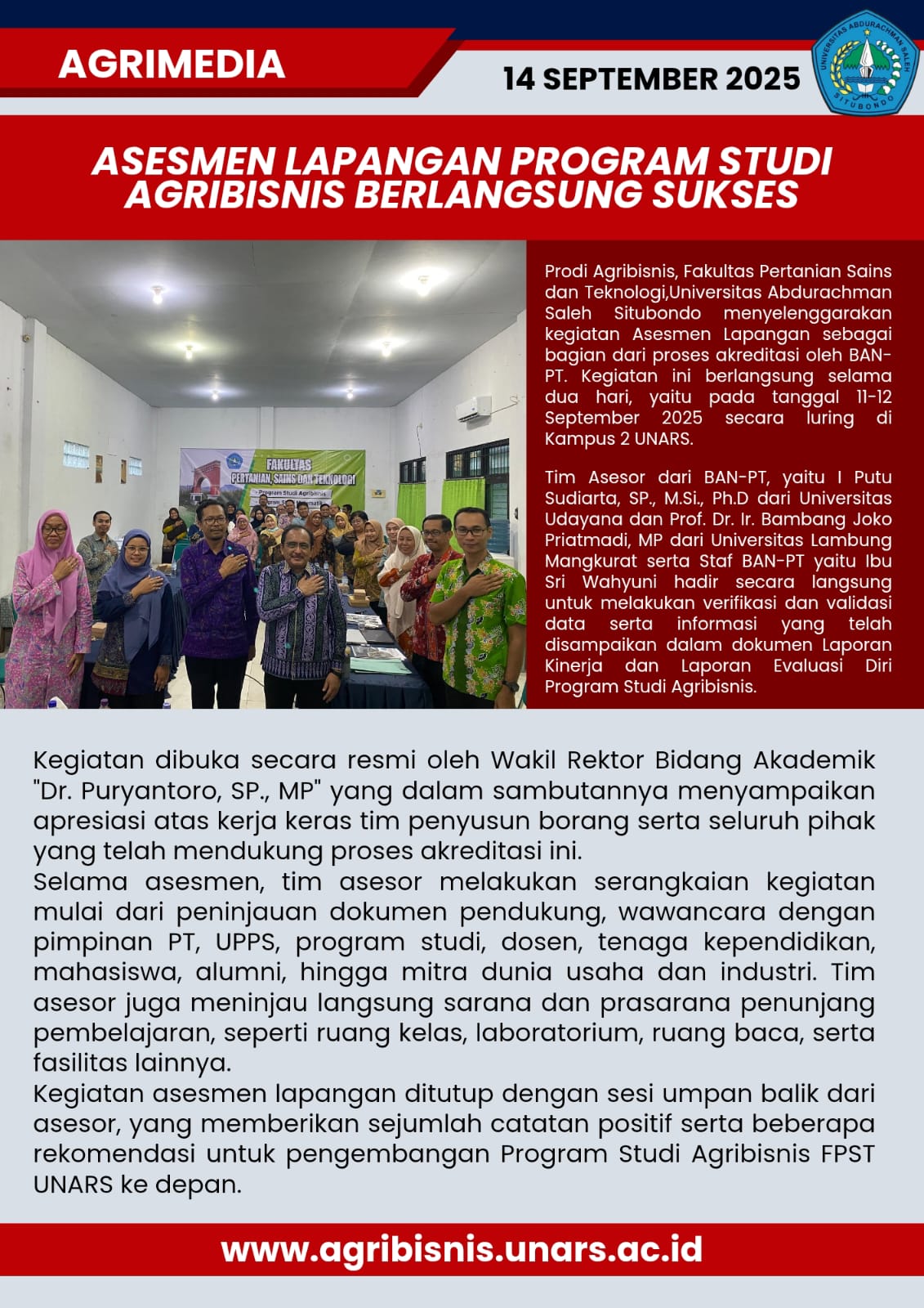 Situbondo, 5 Juni 2025 – Fakultas Pertanian, Sains dan Teknologi (FPST) Universitas Abdurachman Saleh Situbondo (UNARS) menandatangani Memorandum of Agreement (MoA) dengan Fakultas Pertanian Universitas Dr. Soetomo (UNITOMO) Surabaya, dalam upaya memperkuat sinergi Tri Dharma Perguruan Tinggi antar lembaga.